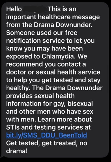 If you feel like you will be unable to personally let your sexual partners know of your diagnosis - head over to Let Them Know or The Drama Downunder. Both websites provide anonymous SMS and email notification options. When you have provided your partners details and choose to SMS them, they will receive a message that looks like this: