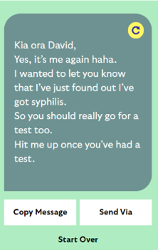 Another website to checkout is Tell Me, a platform created by Burnett Foundation Aotearoa. This is a cute text generator that you can populate with all sorts of relationship dynamics, STI’s and whether or not you want to hook up with them again. It looks a little like this: